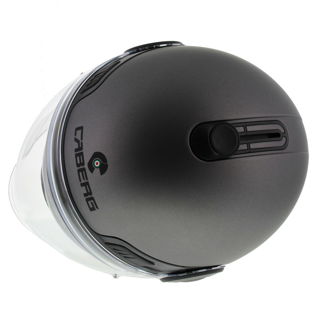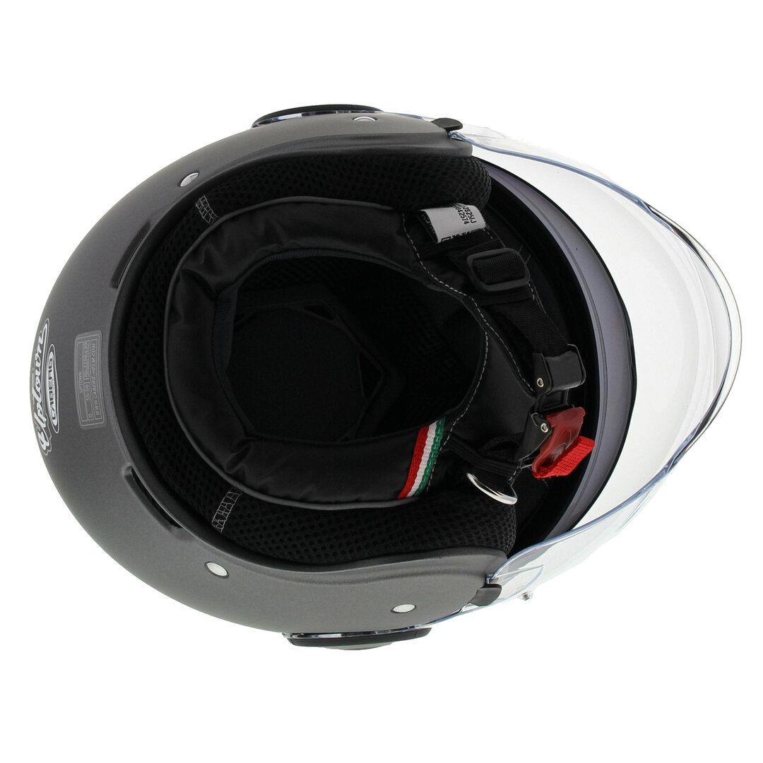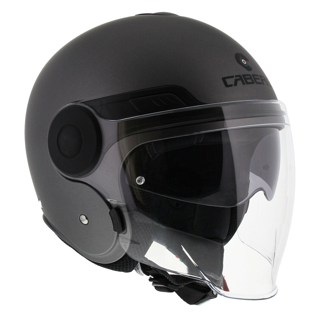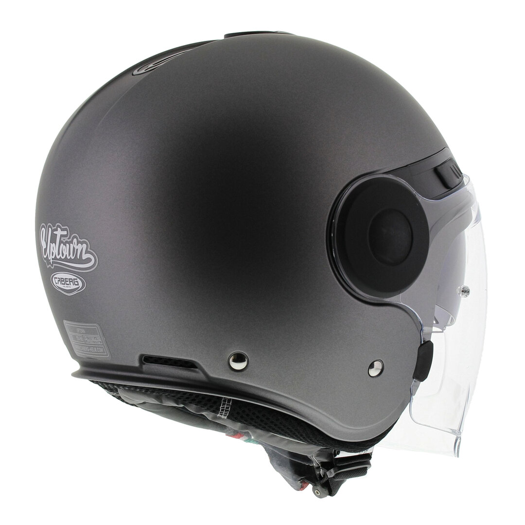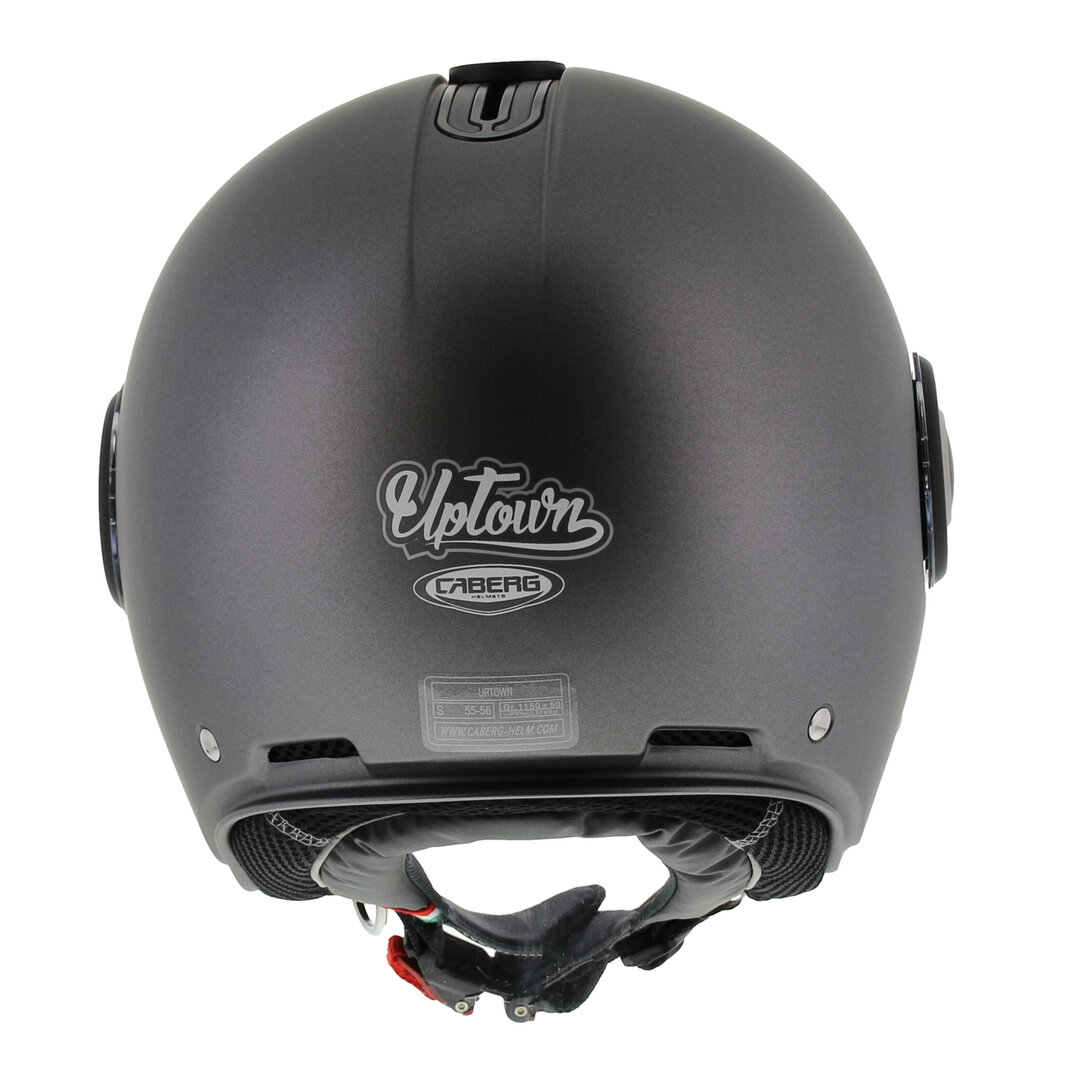 Caberg Uptown Helmet - Matt Anthracite The Uptown, a beautiful and versatile open face helmet from the Caberg range. The helmet has a compact shape and high neck, addapting to any urban environment. The neck has high quality leather stitching and a beautiful vintage feel. The Uptown has a nice long visor, which is pinlock prepared. The helmet also has a fully integrated sun visor, that can be operated while driving. The open faced helmet is well ventilated and the lining is fully removable and washable. This helmet is available in solid colors matte black or matte anthracite, and is also available in Legend Matt black-white. Specifications: • Polycarbonate shell in 2 shell sizes • Available in sizes XXS - XXL • Integrated anti-scratch sun visor • Micro buckle closure • Removable and washable lining • ECE R22-05 tested Made in Italy, this helmet is legal for road use throughout Europe and meets the strict ECE R22-05 safety standards. Seen this helmet cheaper elsewhere? Send us a message for a pricematch!
