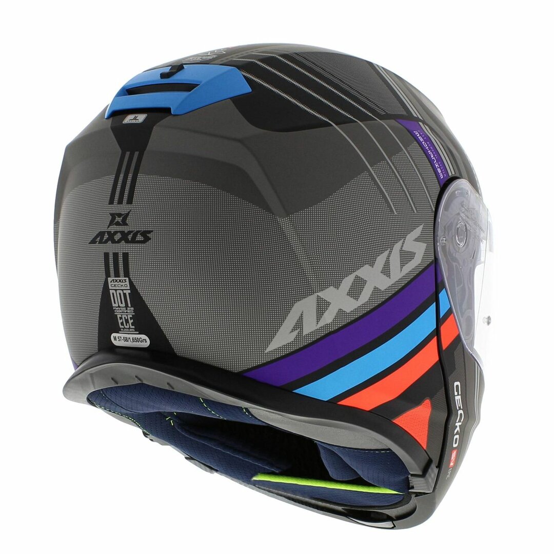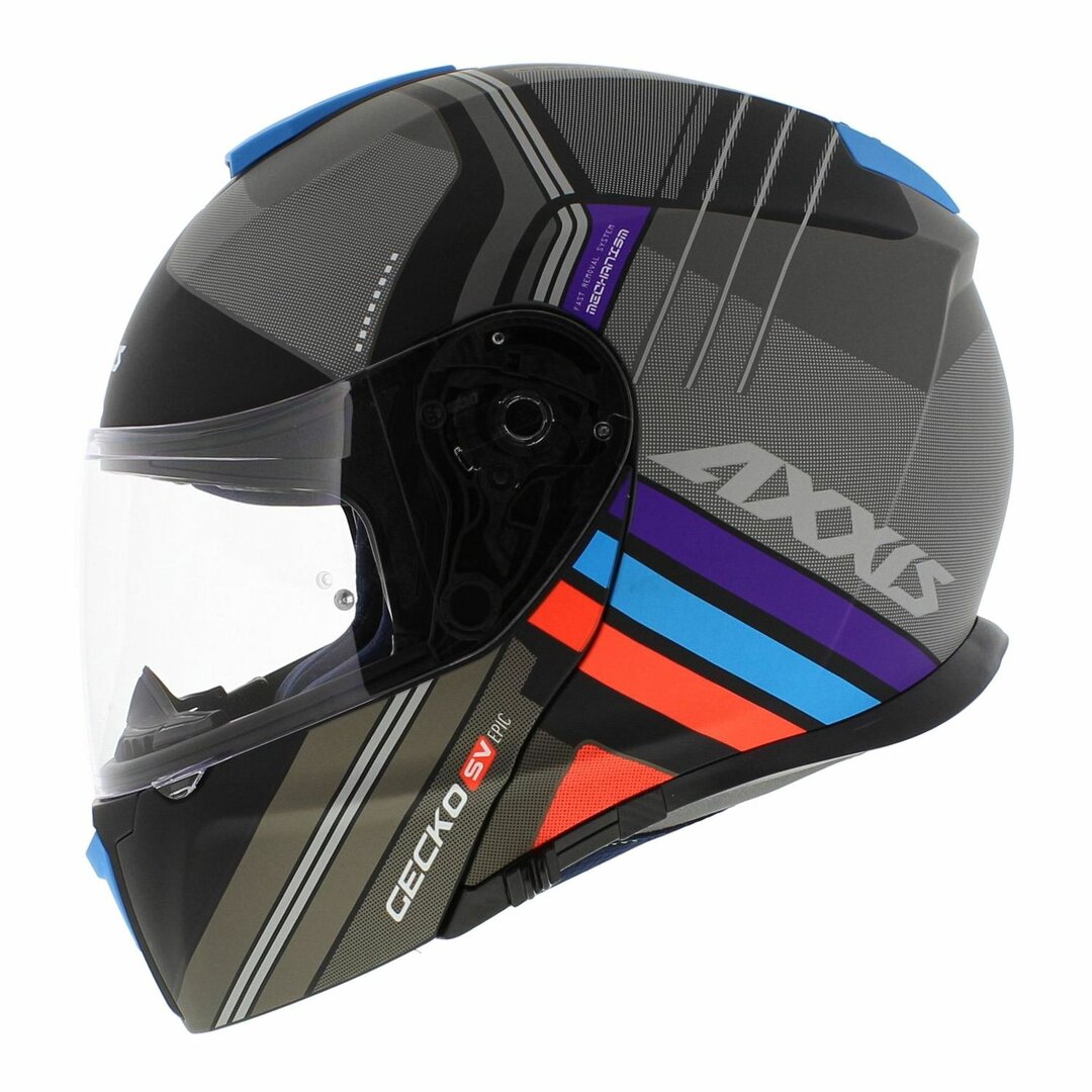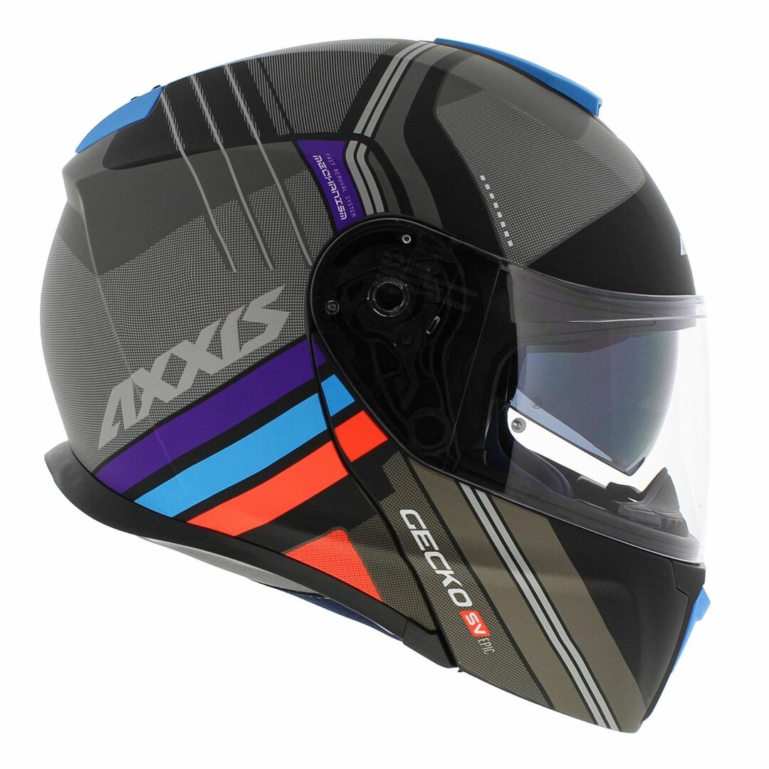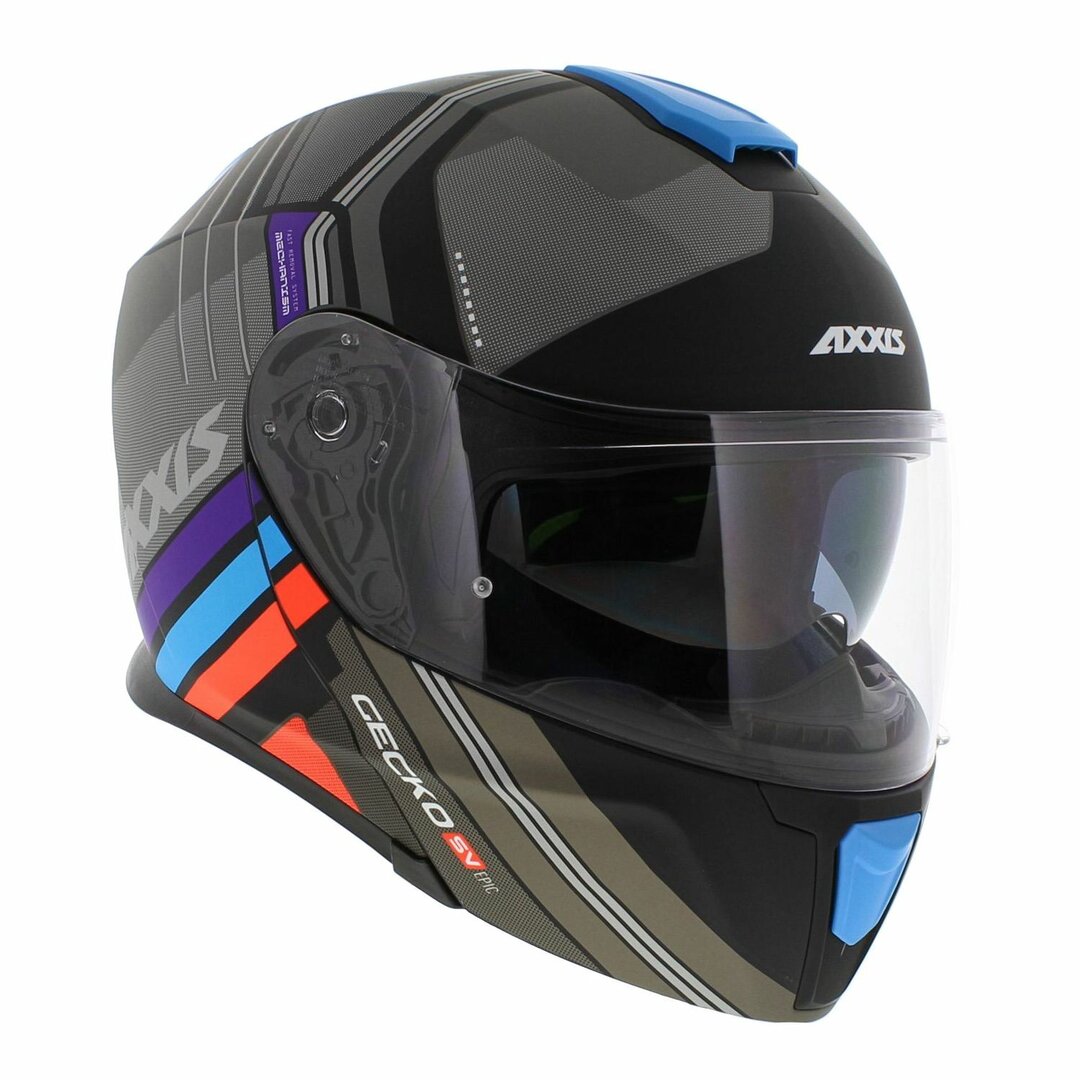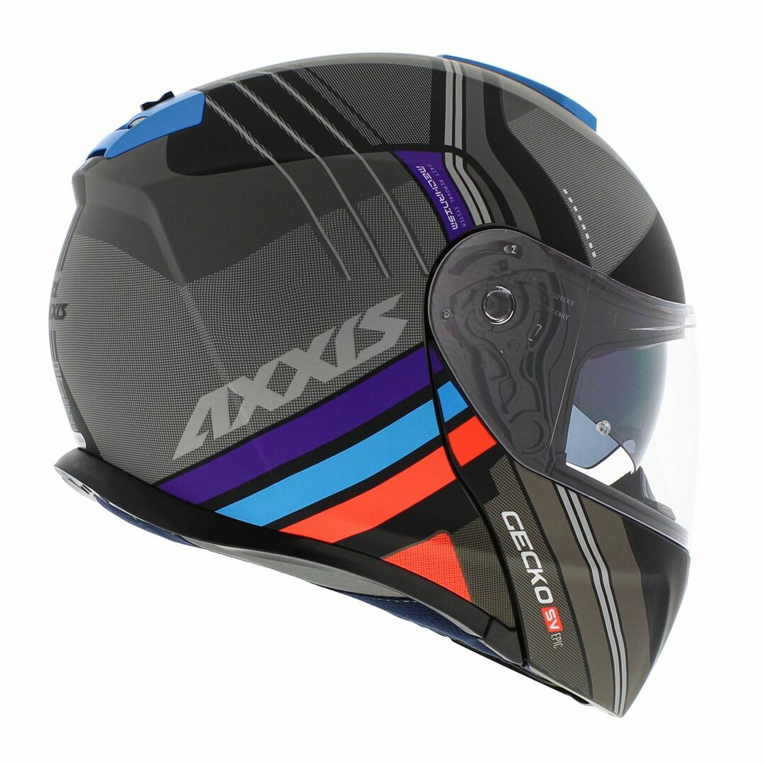 The Gecko SV is an extremely comfortable modular helmet from AXXIS Helmets. Wherever your next journey takes you, the Gecko SV does it all with style and precision. This modular helmet is the perfect companion for all types of riding conditions. The Axxis Gecko is equipped with an easy-to-use sun visor and has a MaxVision pinlock preparation. The outer shell is made of a strong ABS composite and is available in 2 sizes. This makes the helmet comfortable to wear in all sizes. The Gecko SV system helmet has a comfortable inner lining, made of antibacterial and water-repellent fabrics. Furthermore, the helmet is equipped with ventilation on both the chin and the forehead and extractors at the back to create the optimal possible climate in the helmet. This means the helmet remains comfortable to wear in all weather conditions, no matter how long your ride lasts. The Gecko has a fully removable and washable inner lining and weighs 1600 grams. A 100% Max Vision Pinlock lens is available for the Axxis Gecko SV, to keep the visor from fogging up. Order the Pinlock in the bundle for an extra discount! The Axxis Gecko SV is approved for public roads and has both an ECE and a DOT homologation, and thanks to the double P/J homologation, the helmet is approved in both open and closed position! Specifications: - Advanced ABS outer shell, produced in 2 shell sizes. - Excellent fit. - Internal sun visor, easy to operate with one hand. - Removable and washable inner lining. - 100% Max Vision Pinlock prepared visor. - 2.2mm thick clear anti-scratch visor. - Improved air ventilation system which can be opened and closed. - Micrometic chin strap quick release. - Weight 1600 grams (+/- 50 grams) - ECE-DOT approved for use on public roads. - Available in sizes XS-S-M-L-XL-XXL